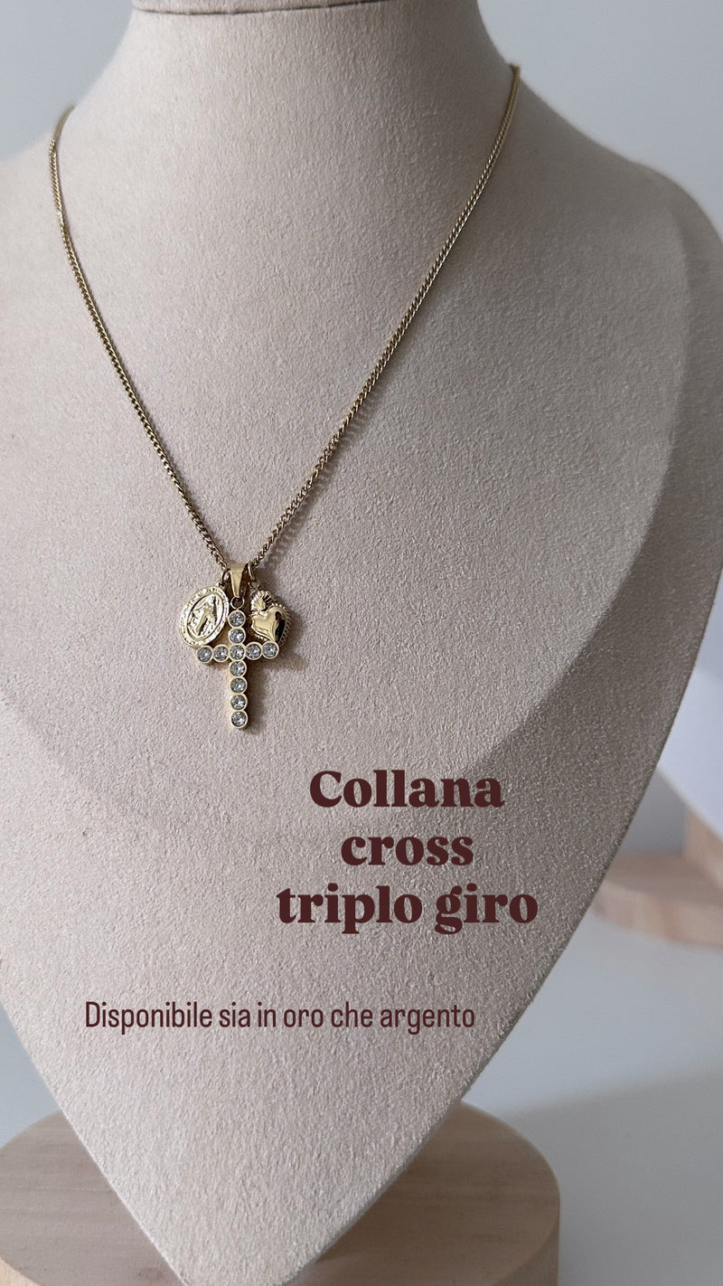 Collana con triplo charms con croce madonina e cuore sacro in acciaio inox